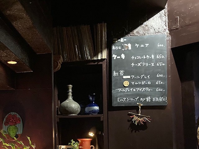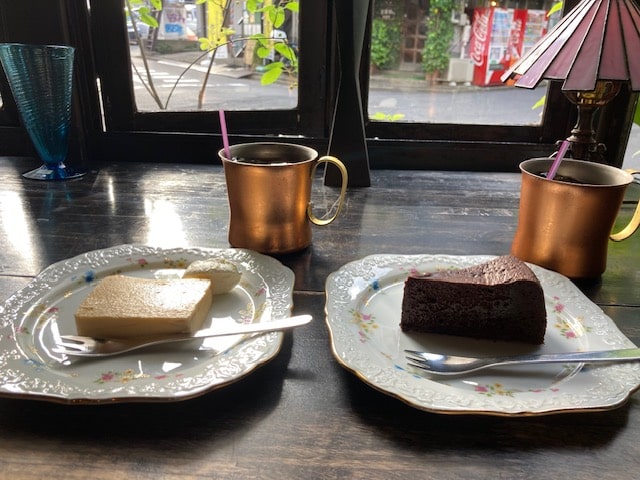 コーヒーは、本日はケニア。メニューはそんなに種類なくシンプルです。ケーキはいつもこの2種類ですが、どちらもほんとにおいしい!コーヒーは、注文後にハンドミルで豆を挽き、ハンドドリップで淹れてくれます。