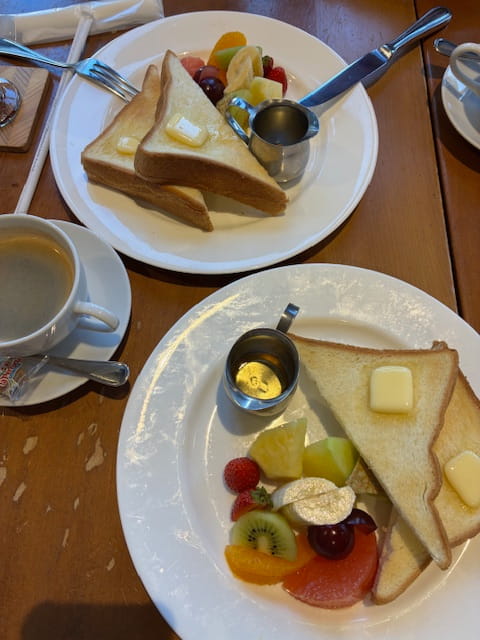この日のお目当ては「フルーツモーニングセット」厚切りトースト(バター、はちみつ付き)に、色とりどりのカットフルーツがたっぷり。飲み物もセットに含まれます。