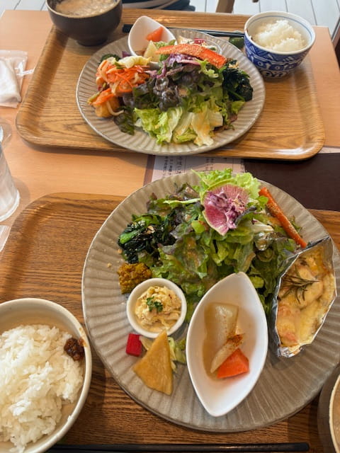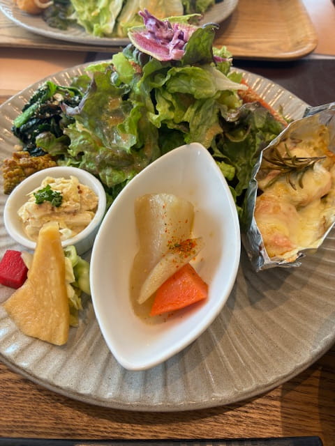 葉物野菜を中心にサラダ、煮物、和え物、漬物などなど少しずつ盛り付けられていて、見た目からもう身体によさそう。ひとつひとつこれは、何の野菜だろう?これはカレーの味付けだ!とか楽しみながら、食べれました。素材の味がしっかり感じられるお料理は、身体が整っていく感じがします。