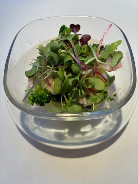 ガラスの器で見た目も美しい!シャキッとした食感とやさしい味付けが印象的。これから始まるお料理への期待が高まります。