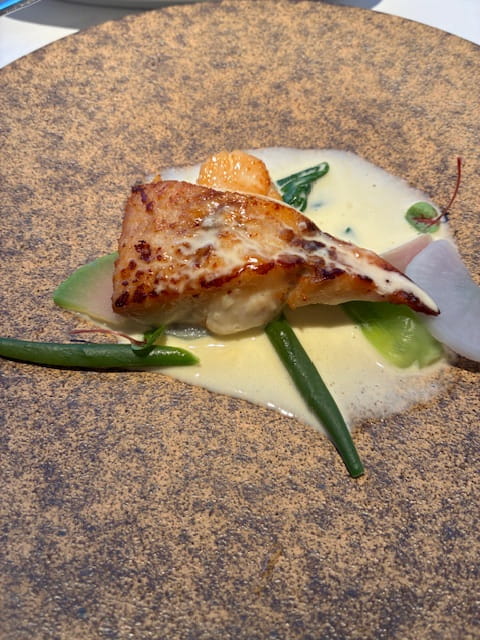メインのお料理は、数種類の中から選んだお魚料理。今日はスズキでした。香ばしく焼かれたお魚は、季節の野菜とホタテが添えられています。