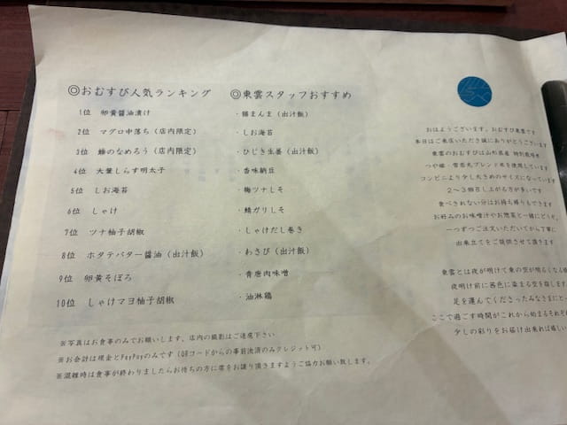 メニューをみると、おむすび人気ランキングと東雲スタッフおすすめが10位くらいまでのっています。